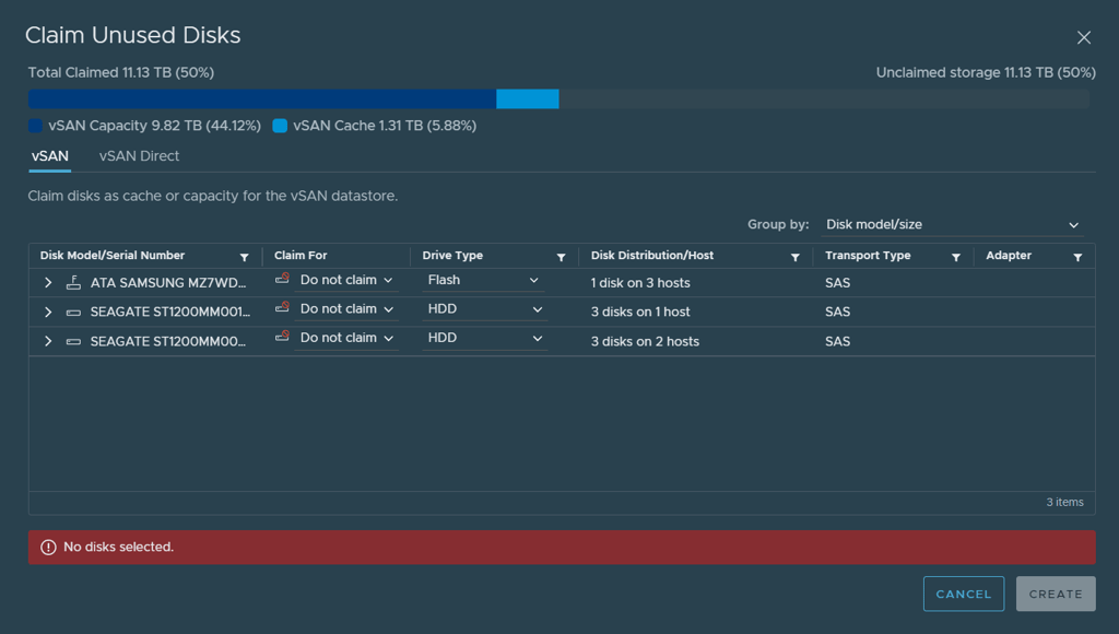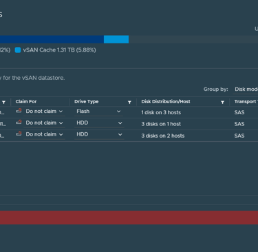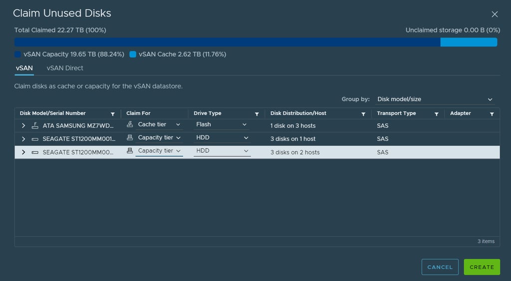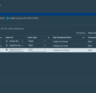 Now we will claim each SSD for our cache tier and our HDDs for the capacity tier doubling the total vsan capacity from 11.13TB to 22.27TB. Now that is the RAW amount and not usable. You should also keep capacity under 80% full to allow for disk or host failures.