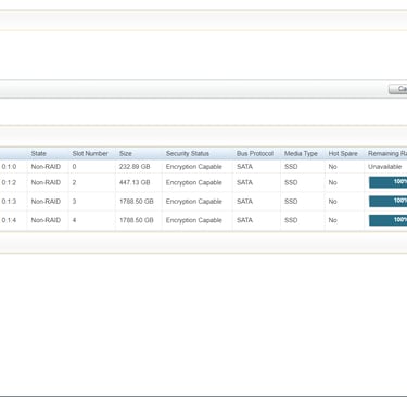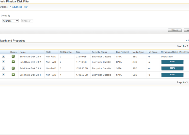 Here they are showing up as 100% write endurance remaining in iDRAC (I also manually tested them as well in crystal disk info and they all passed). They are all set as Non-RAID to pass the disks directly through to VMware.