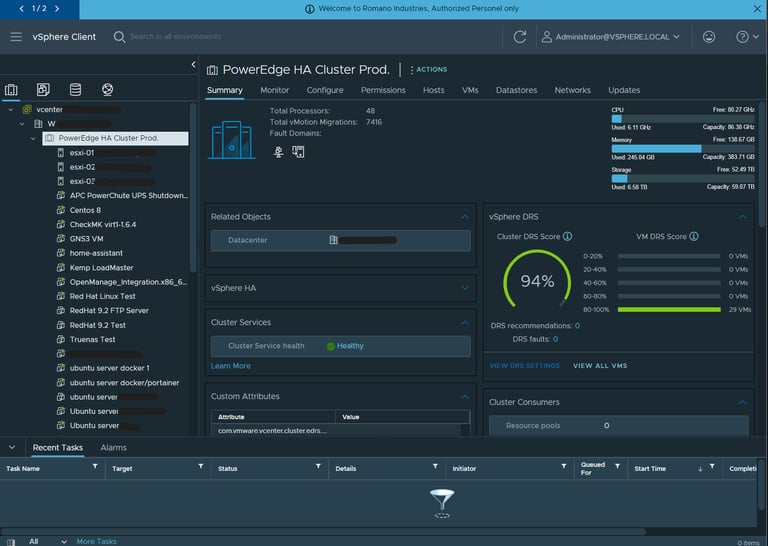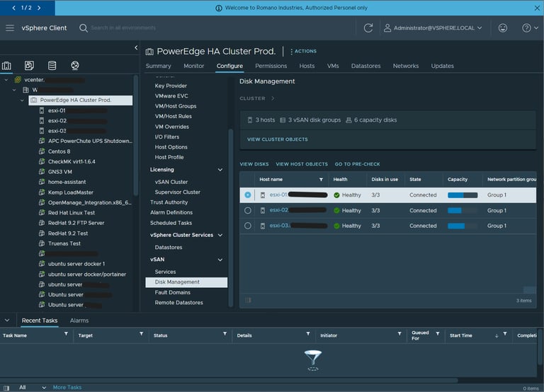 So much easier to manage servers with vSAN enabled, instead of using the hardware RAID that was built into the Dell R630. Now with DRS and vSAN enabled all I have to do is right-click and put a host into maintenance mode and then all the VMs running on that host automatically move to another host.